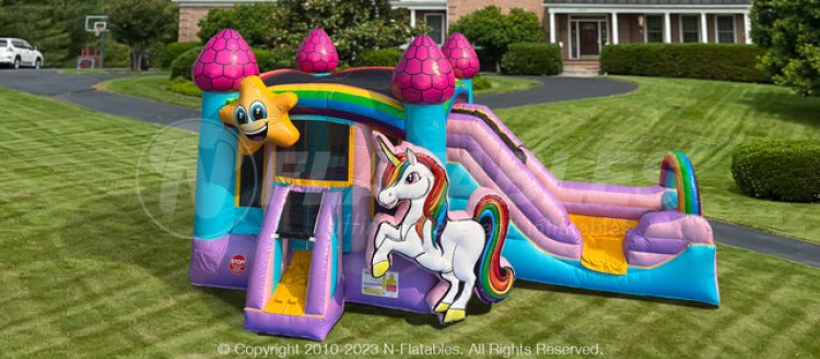 Bring the magic to your next party with our Rainbow Unicorn Combo Bounce House! 🦄🌈 This colorful inflatable is bursting with fun and fantasy, featuring a vibrant rainbow design with dazzling sparkle fabric and an adorable unicorn theme that instantly captures kids’ imaginations.