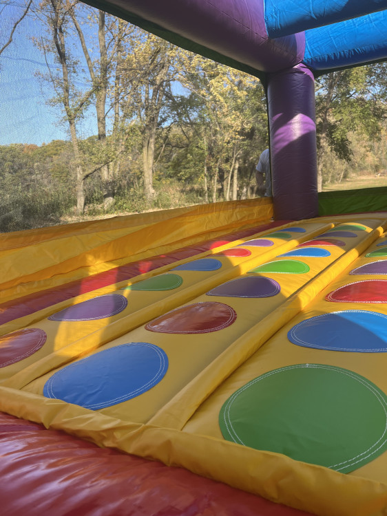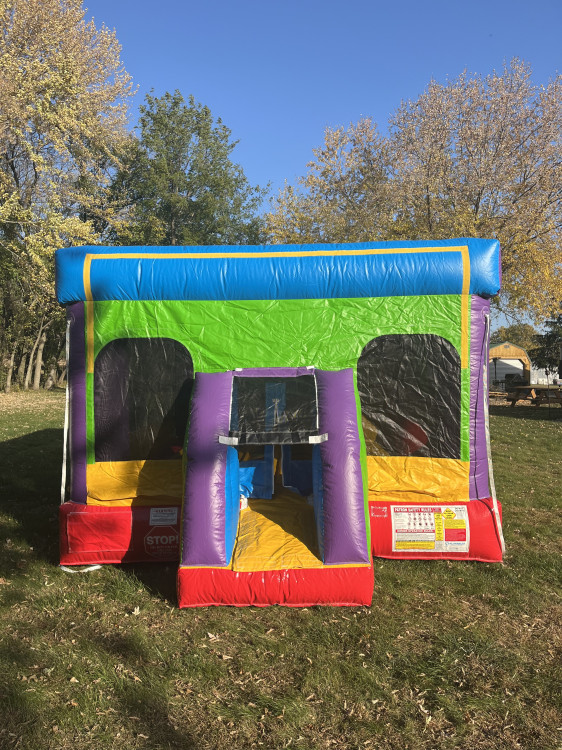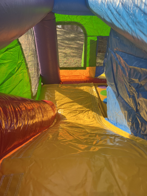 Big fun in a compact size! Standing only 8 feet tall, this fully enclosed, wacky-colored bounce house combo unit is packed with action. Kids can bounce, climb, and slide — plus enjoy a built-in entanglement game mat sewn right into the jumping surface. The unit includes two entanglement dice to keep the fun rolling. Wide mesh windows give parents clear visibility while kids play, and the space-saving design makes it perfect for both indoor and outdoor use.